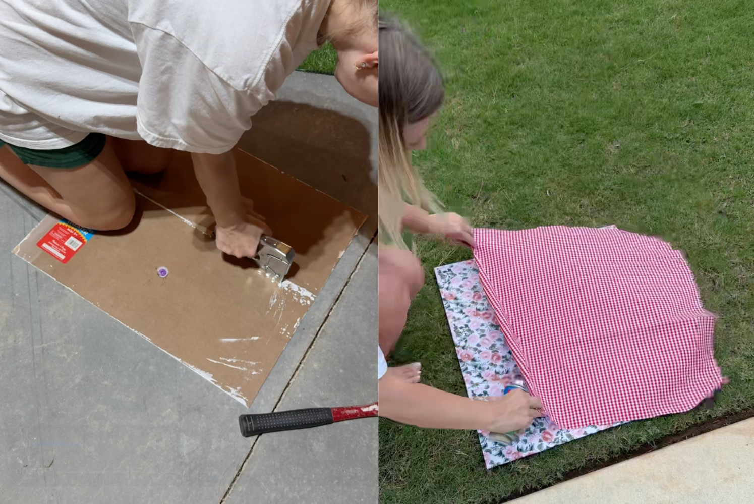 The little clock came off easily with pliers. I then used a staple gun to attach the clock board and chalkboard together, creating one larger panel. To cover it, I wrapped both sides in fabric and secured it with a staple gun. At first, I tried a floral print but decided it was not quite right. Using spray adhesive, I added a red gingham fabric panel to one side instead. Now the board is reversible, which is a fun surprise.
